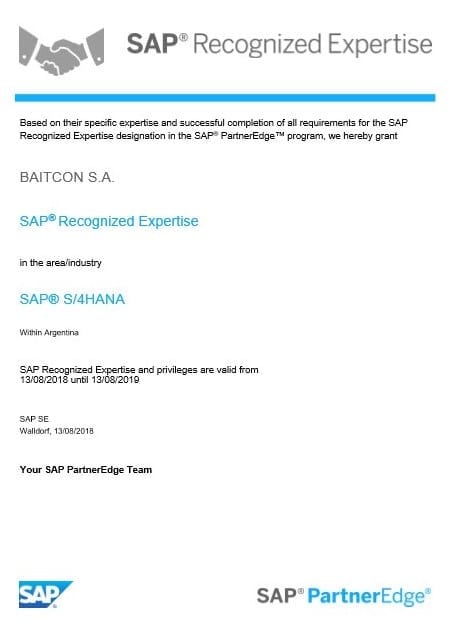 De la mano de Baitcon, seguimos avanzando en el desarrollo de la transformación digital, y en esta oportunidad, el título otorgado es en virtud del ERP S/4 Hana, y tiene una validez de un año.