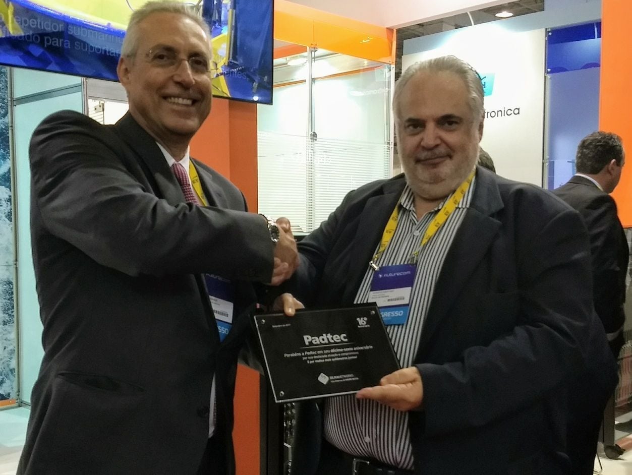 En este marco Horacio Martínez, CEO de Grupo Datco, le entregó a Manuel Andrade, CEO de Padtec, un reconocimiento de Silica Networks, nuestra marca a cargo de la propia red de fibra, por sus 16 años de trayectoria.